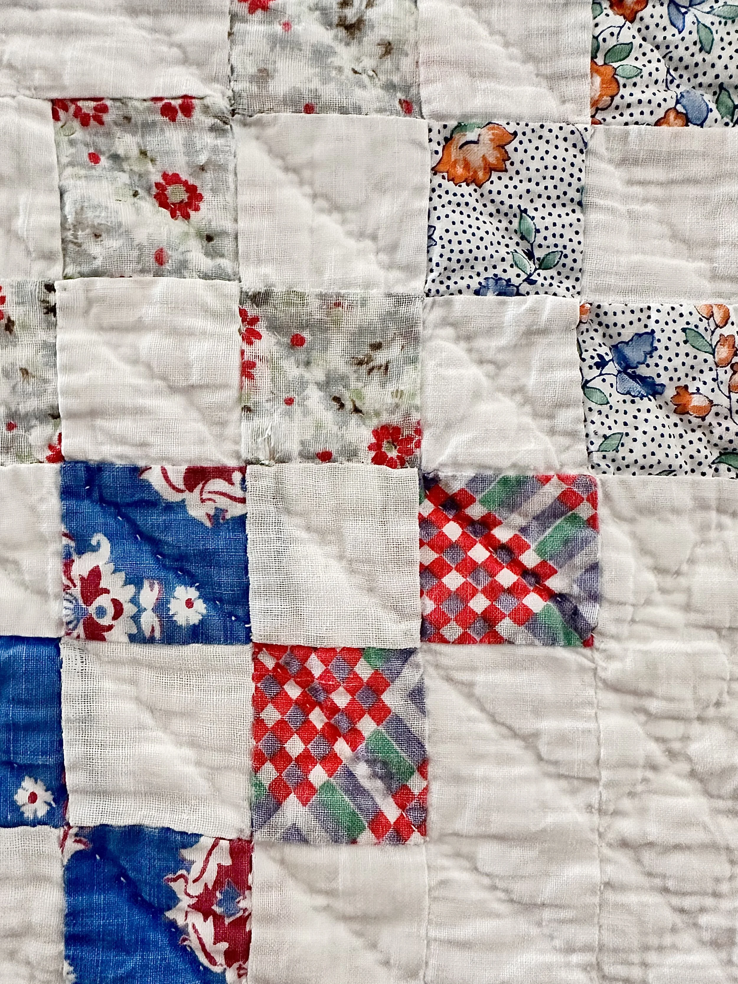 Such a wonderful version of a scrappy quilt, with neat rows of squares crisscrossing in chains, with little 1.25” squares made of a great assortment of feedsack fabrics. Notice the way the quilter chose to cluster the various fabrics into distinct areas, blending them gracefully from one section to the next. She’s a quilt that’s neat and crisp yet playful. Beautifully quilted in a small grid pattern, she has a lovely texture. She has been washed by hand, and is in excellent condition with just one area of the faintest discoloration on the white (hardly noticeable at all), and one small seam opening along the side of a square — an easy fix. See last two photos. A really lovely piece of feedsack history to bring into your collection!