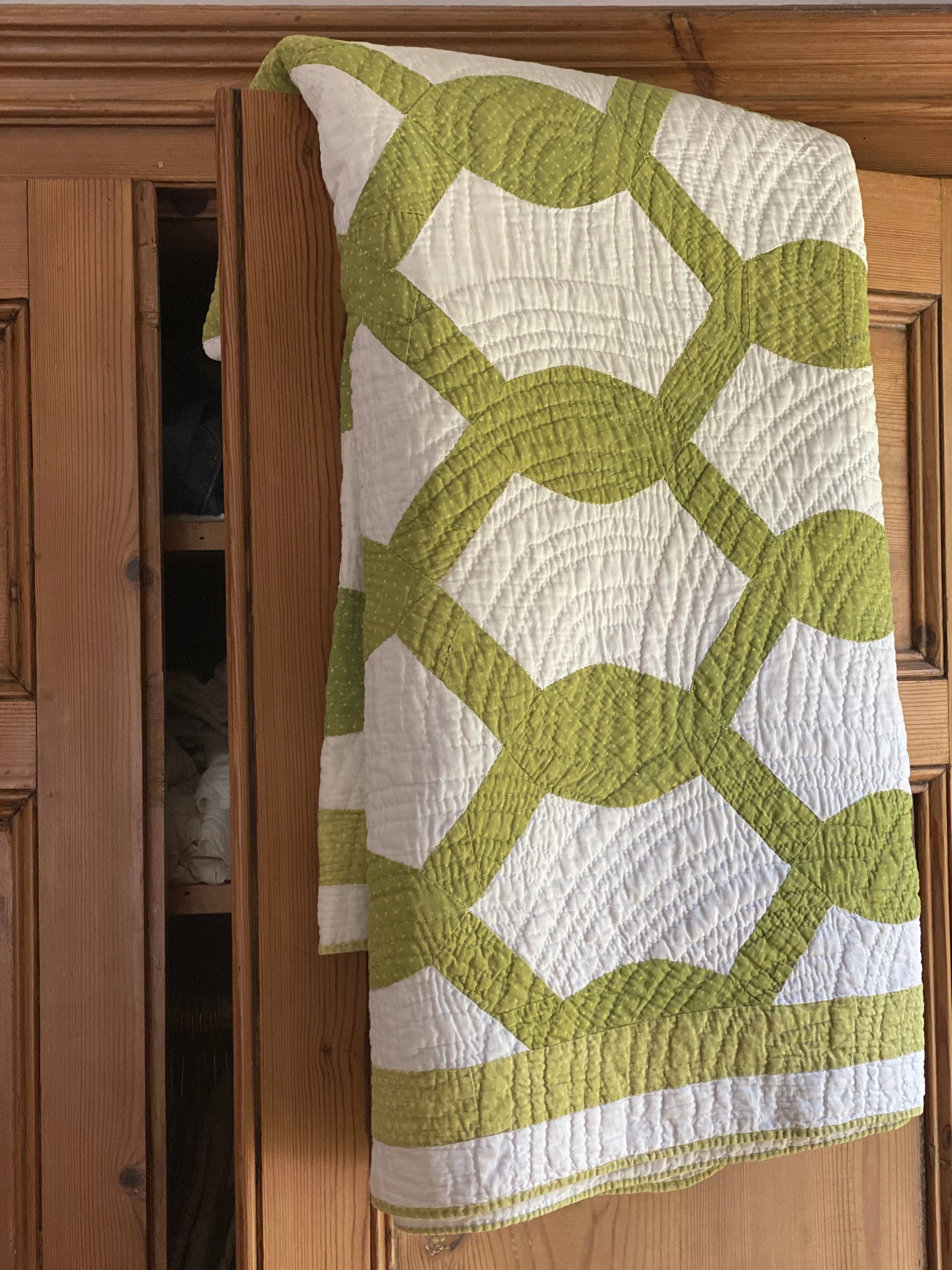 Understandably chosen to be documented by the Illinois Quilt Research Project, this exquisite quilt from the mid to late 1800s, is a simple yet stunning masterpiece. The verdant green links are meticulously appliquéd onto the white ground, in some places using several pieces of green fabric pieced together to create the correct shape. The clamshell quilting echoes the beautiful curves of the links and the lighter green frame gives the quilt an additional dimensionality. Placed anywhere in the home, she will bring the soothing green of nature into your home. A truly special piece especially for a lover of the outdoors. She’s in excellent condition for her age, with only a couple tiny light marks on the front and a few more marks and tiny surface hole on the back as shown. She has been thoroughly washed by hand and hung to dry and is ready to become an heirloom in her new family.