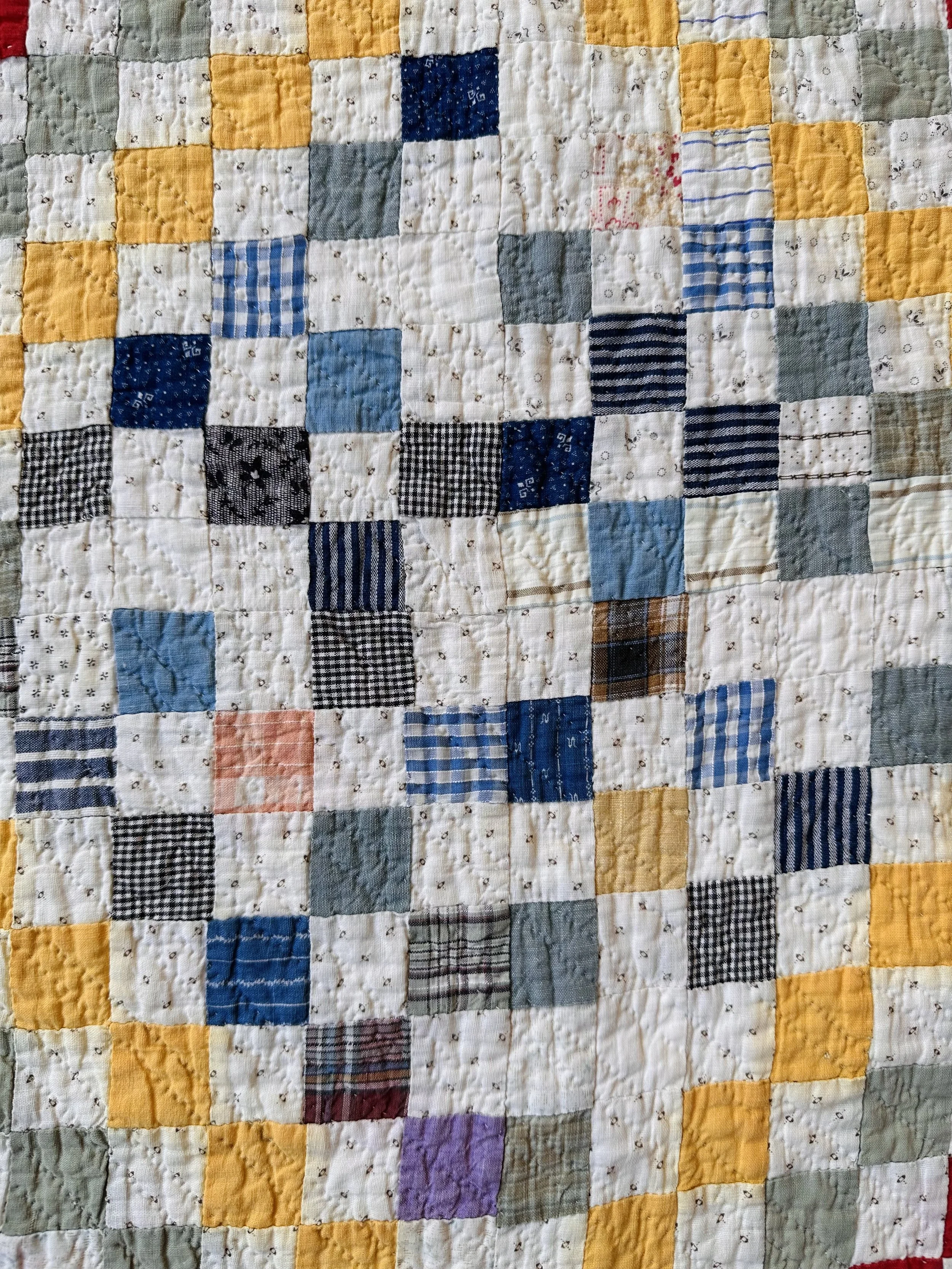 This Sunshine and Shadows Postage Stamp Quilt has all the scrappy appeal of a classic postage stamp with little squares (each measuring 1 1/4”) but with a bright red and yellow graphic that gives the quilt a pop of color. The red and cheddar squares provide a great contrast to the lovely array of soft calicos and indigos, whites, and grays. One fabric in particular that was likely a deeper blue has faded to a gorgeous gray-green shade. The border is a washed light pink that has faded beautifully. She’s a perfect size to throw over your lap or cozy up with a nap. She has been washed and is in excellent condition with the exception of some very light bleeding of sunshine from her yellow squares. See photos. This quilt is sure to become a favorite!