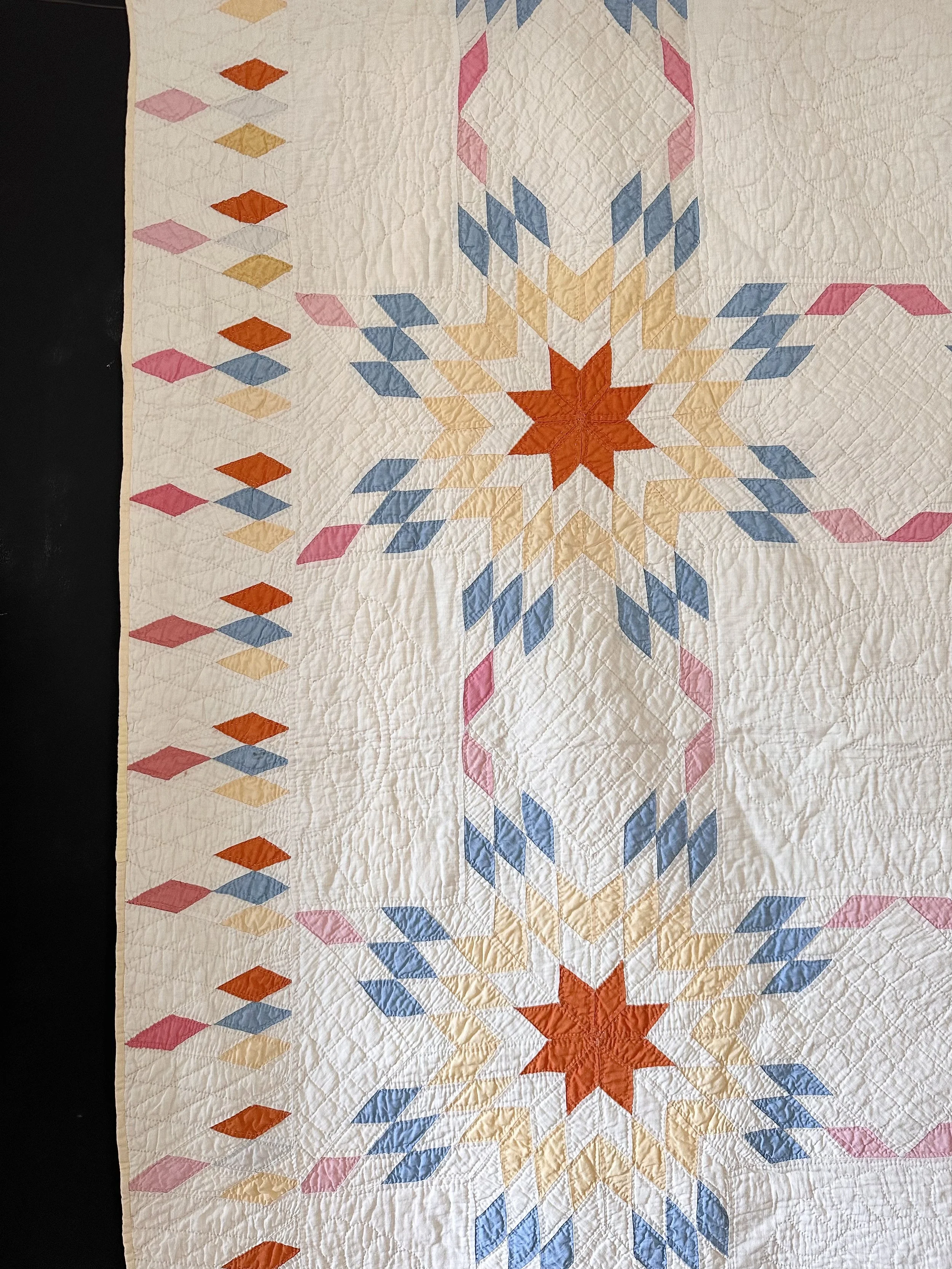All the beautiful, bright, and sunny colors of the sunrise are celebrated in this masterpiece of a quilt, made in the beautiful Touching Stars pattern, and framed by a stunning wide border of star points. The quilting and piecing is expertly done, and the color choices are warm and inviting. Notice the two different tones of pink and blue in the quilt which may have been the same at the start but faded differently — a lucky accident! And to top it off, a lovely yellow back — a swath of sunshine. This quilt has a label on a back corner showing that it was registered with the Illinois Quilt Project in the 80s/90s. She has been washed and is in excellent condition with just a couple tiny, light marks, and one area with some very mysterious and very light blue color transfer that is hardly noticeable. See photos. This quilt is sure to bring much joy and brightness to her new owner.