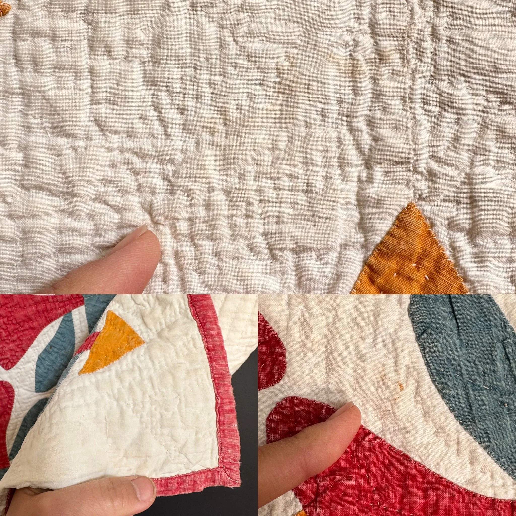 An absolutely stunning flower appliqué quilt from the late 1800s, with the kind of patina that you cannot replicate today. The turkey red, cheddar, and blue-green all have the prettiest touch of fading from her almost century and half of age. Her large scale wreaths set close together make her rich with color, and the little “flying roses” scattered in the in-between spaces give her a fun, whimsical charm. She would be beautiful on a bed, folded at the foot of one, or hanging on a chair or quilt rack, adding the prettiest splash of color to your space. She is in great condition for her age, with just the slightest bit of aging to her white fabric, but nothing at all that stands out. A few tiny little light stains, and a couple points of discoloration on one yellow flower. See photos (last one is of the back). Who will be this beauty’s lucky new owner?